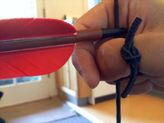For fletching, I recommend feathers. Traditional Chinese arrows used long, low-profile fletching (no taller than the thickness of the shaft). Since I do not use custom fletch cutters, I typically order 4" or 5" parabolic feathers. If the front tip of the fletching feels hard and plastic-like (due to a flaw in the manufacturing process), you may want to use a file to rub it down or cover it with a dab of a thick viscous glue such as Duco Cement (so it is less likely to slice your hand during a shot). I have not shot arrows with plastic vanes, as I am uncertain whether the semi-rigid plastic would injure the hand.